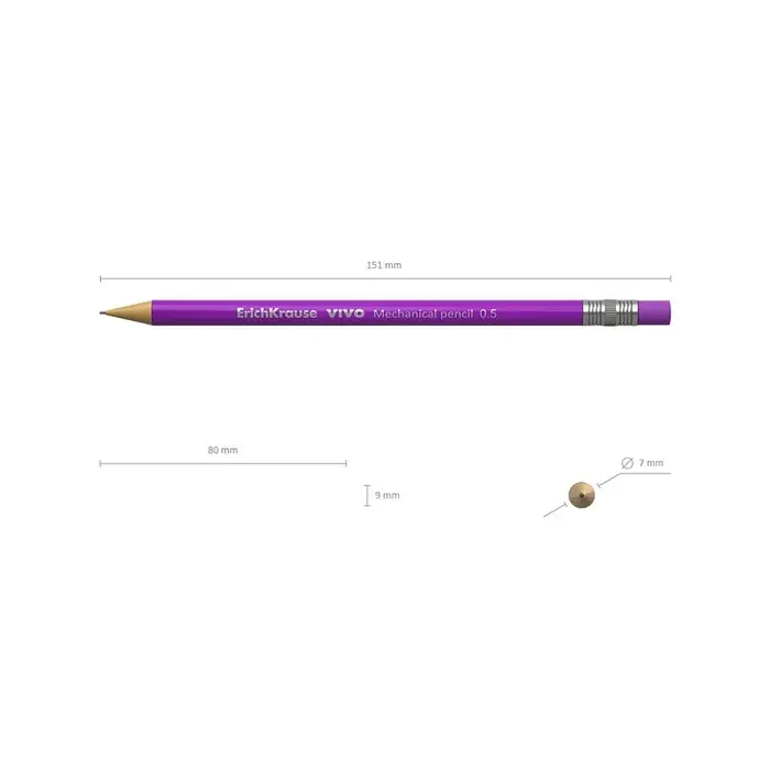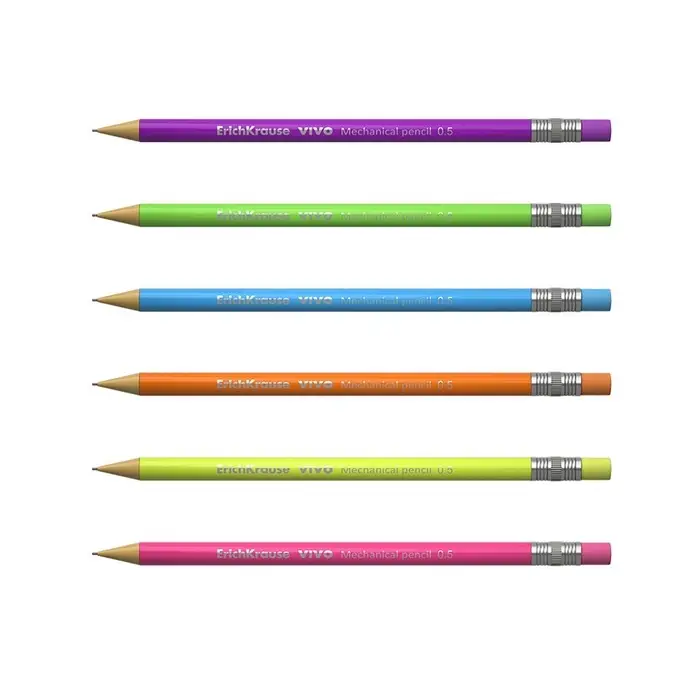 Круглый механический карандаш. Корпус и кнопка-ластик в ярких неоновых цветах. Твердость HB. Диаметр грифеля 0.5 мм.