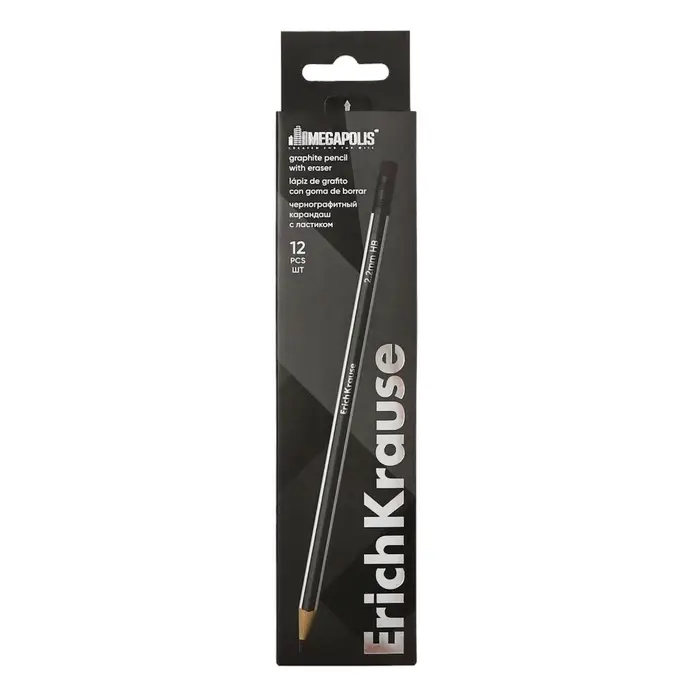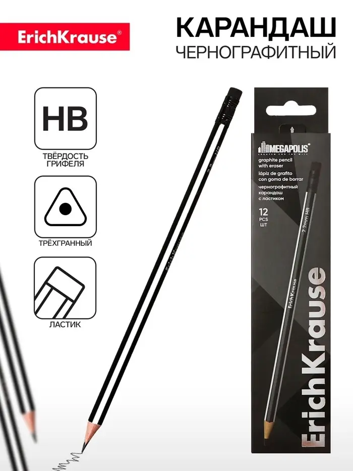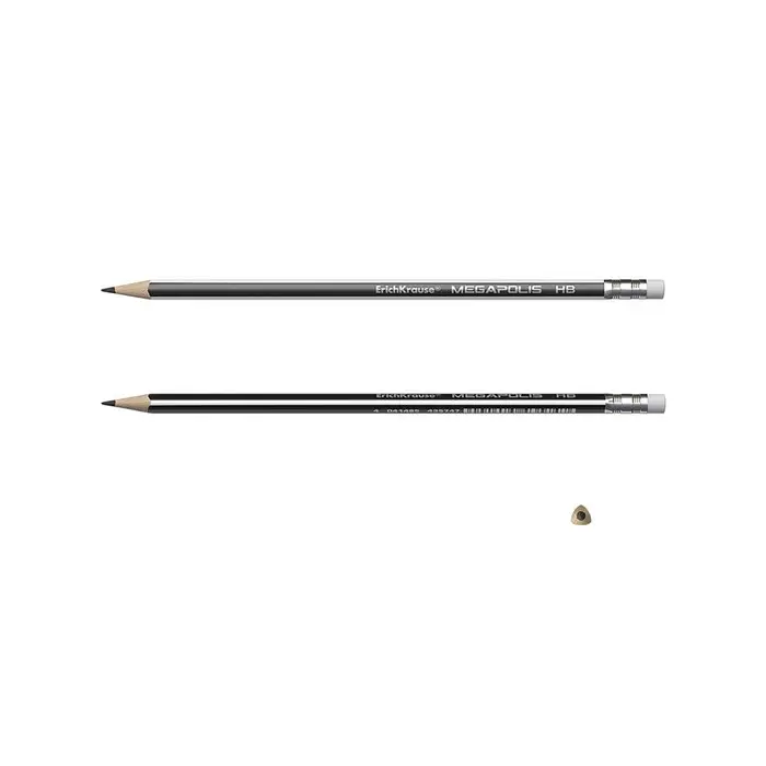 Карандаш чернографитный, ErichKrause «Megapolis», HB, d=2.2 мм, с ластиком, трёхгранный в коробке, дерево