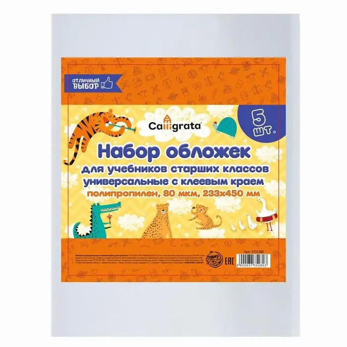 Набор обложек ПП 5 штук, 233 х 450 мм, 80 мкм, для учебников старших классов, с клеевым краем, универсальные