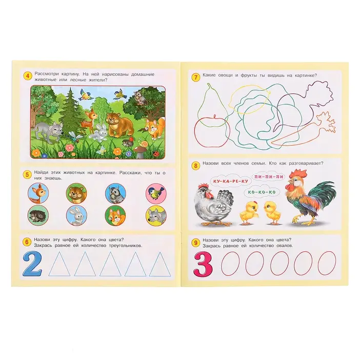 - Тематика охватывает буквы, цифры, геометрические фигуры, цвета, времена года и животных, формируя целостное представление об окружающем мире.