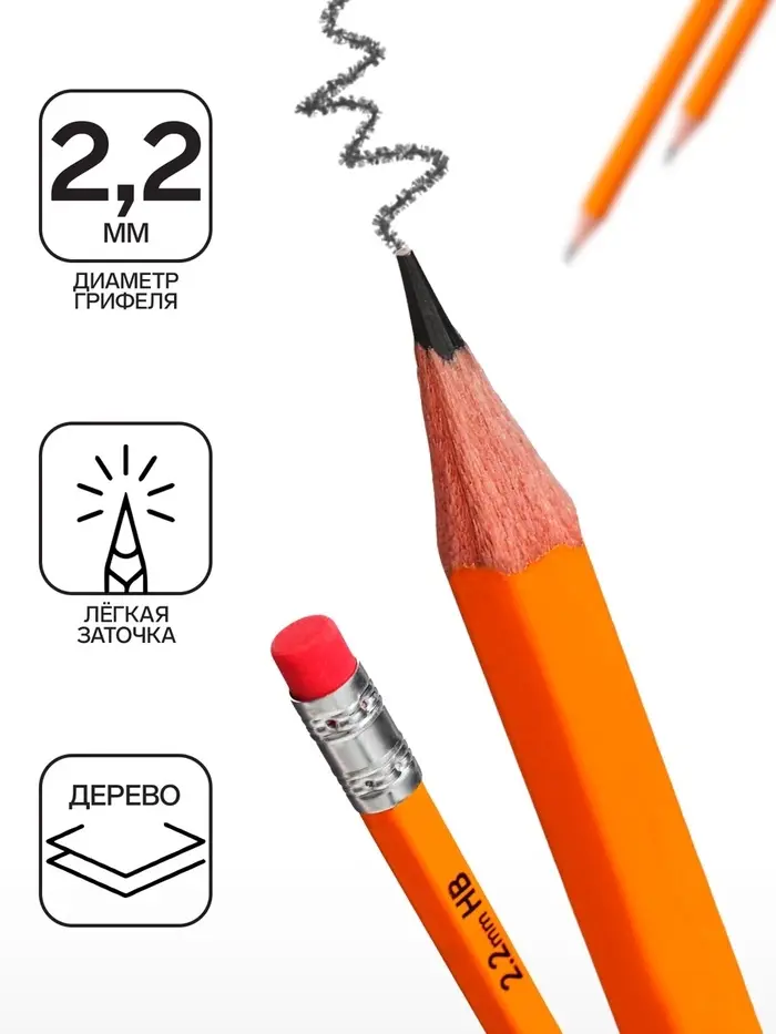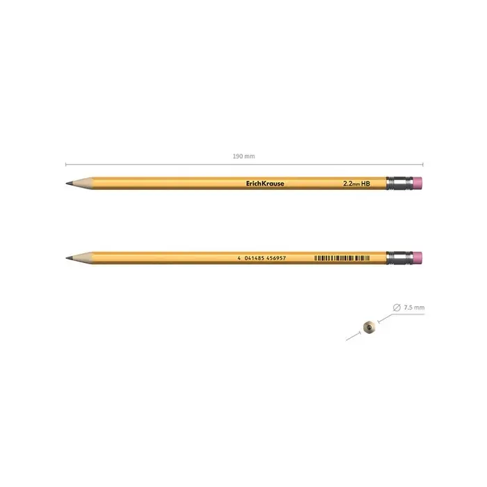 Классический шестигранный чернографитный карандаш с ластиком из отборной древесины, твердость НВ. Специальная пропитка древесины и сплошная проклейка грифеля обеспечивает высокую ударопрочность. Мягкая древесина и идеальная центровка грифеля гарантируют легкую заточку с экономным расходом карандаша. Грифель диаметром 2,2мм не царапает бумагу и не крошится. Ластик карандаша средней жесткости изготовлен из экологически чистого и гипоаллергенного материала термопластичной резины (TPR). Не содержит ПВХ.