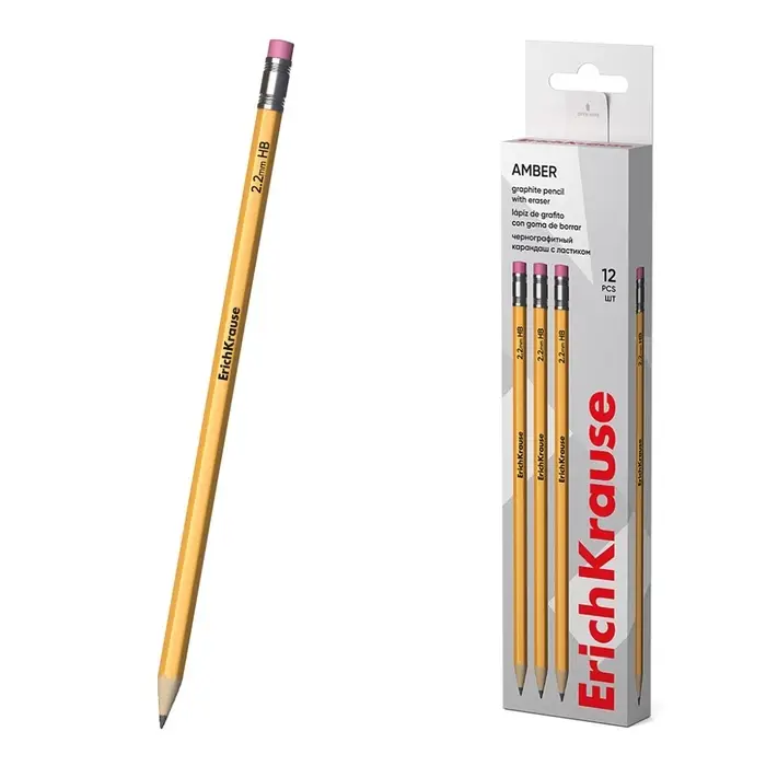 Карандаш чернографитный с ластиком, ErichKrause, Amber 101, НВ, дерево, шестигранный, в коробке, жёлтый корпус