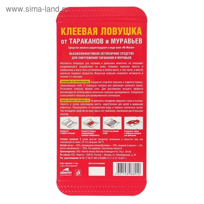Бдительный страж клеевая ловушка от тараканов и муравьев, домик с приманкой аттракантом. Абсолютно безвредно для человека и домашних животных, не оказывает раздражающего воздействия на кожу. Клеевые ловушки Бдительный Страж просты в применении и могут быть установлены в любом месте, в том числе в местах хранения пищевых продуктов. Вскрытые ловушки сохраняют активность в течении трех месяцев.ПРЕИМУЩЕСТВАКлей сильной фиксацииВлагостойкий картонСОСТАВСодержит в своем составе: каучук - 52%, производные поли-изобутилена - 25%, аттрактант пищевой - 3% и масло минеральное до 100%. Не содержит токсических веществ.СПОСОБ ПРИМЕНЕНИЯАккуратно открыть ловушку и отделить бумагу, закрывающую клей.С помощью клапана для фиксации сомкните замок.Установите ловушку вблизи стен, узких проемах.Для достижения лучшего результата рекомендуется использовать несколько ловушек одновременно. Ежедневно осматривайте ловушки - для своевременной утилизации.