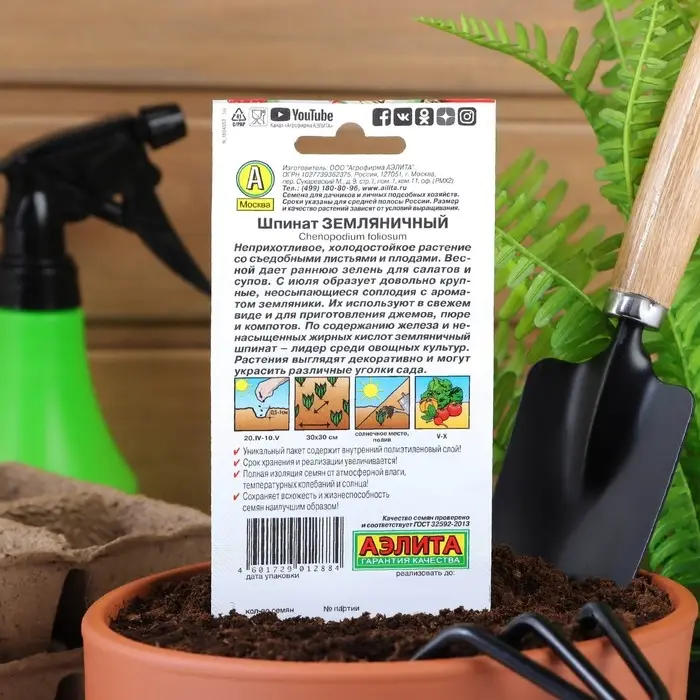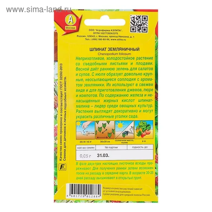 Неприхотливое, холодостойкое однолетнее растение со съедобными листьями и плодами. Весной даёт раннюю зелень для салатов и супов. С июля образует довольно крупные, неосыпающиеся соплодия с ароматом земляники. Их используют в свежем виде и для приготовления джемов, пюре и компотов. Зелень и ягоды содержат богатый набор витаминов и других полезных биологически активных веществ. По содержанию железа и ненасыщенных жирных кислот шпинат- малина – лидер среди овощных культур. Его применяют для повышения иммунитета и лечения диатеза у детей. Растение, усыпанное ярко-красными соплодиями, выглядит декоративно и может украсить различные уголки сада.