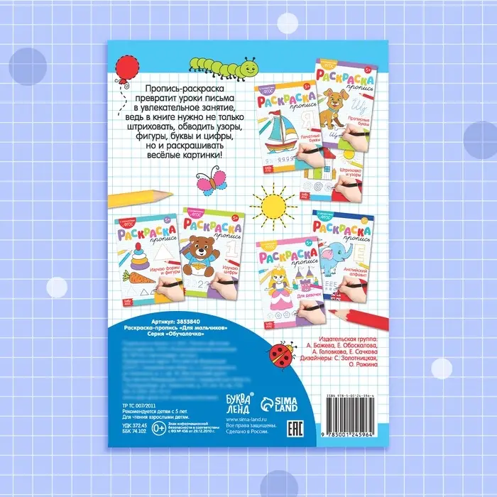 Набор прописей-раскрасок разработан с учётом стандартов образования ФГОС. Занимаясь по ним, ребёнок сможет подготовиться к школе.