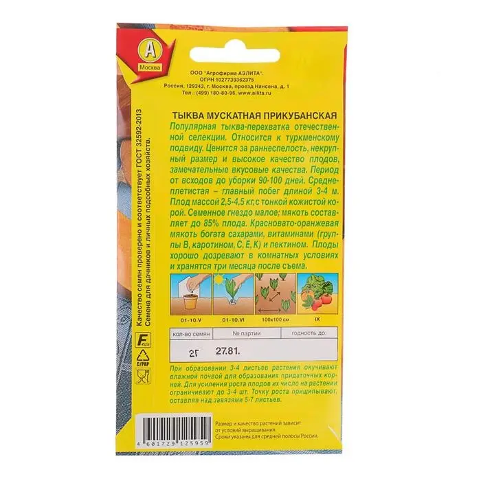 Популярная тыква-перехватка отечественной селекции. Относится к туркменскому подвиду. Ценится за раннеспелость, некрупный размер и высокое качество плодов, замечательные вкусовые качества. Период от всходов до уборки 90-100 дней. Среднеплетистая – главный побег длиной 3-4 м. Плод массой 2,5-4,5 кг, с тонкой кожистой корой. Семенное гнездо малое; мякоть составляет до 85% плода. Красновато-оранжевая мякоть богата сахарами, витаминами (группы В, каротином, С, Е, К) и пектином. Плоды хорошо дозревают в комнатных условиях и хранятся три месяца после съема.