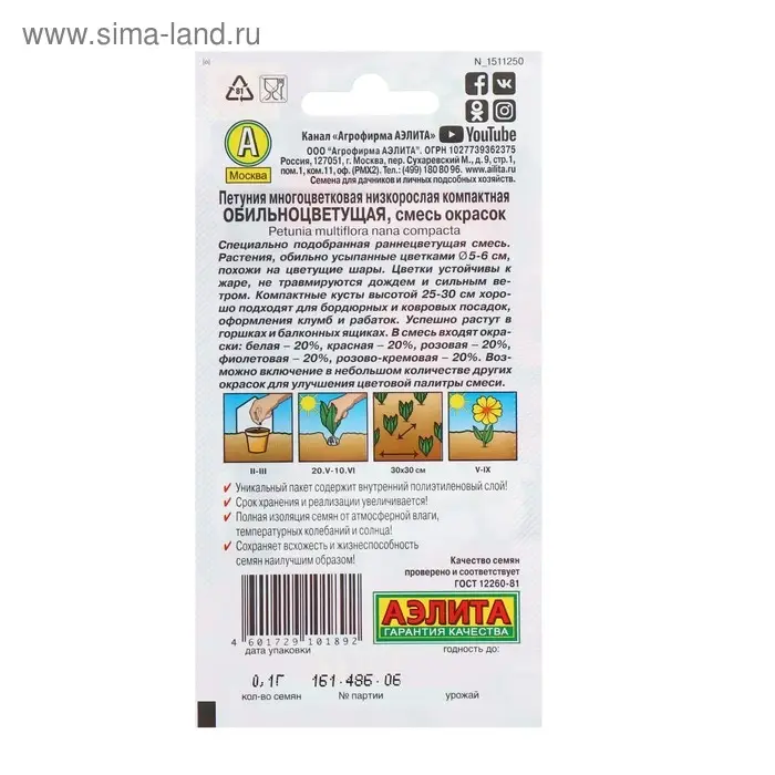 Специально подобранная смесь популярного летника. Порадует вас цветочным изобилием с мая до осенних заморозков. Компактные кусты высотой 25-30 см хорошо подходят для посадок в бордюрах на клумбах и рабатках, успешно растут в балконных контейнерах, подвесных кашпо, подоконных ящиках. Цветки Ø5-6 см устойчивы к жаре, не травмируются дождем и сильным ветром. Растения цветут на 70-75-й день после посева.