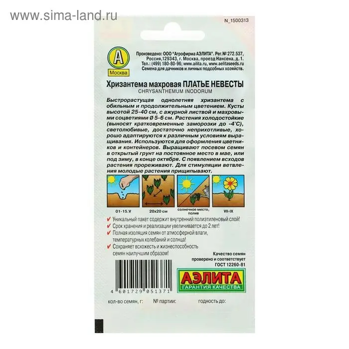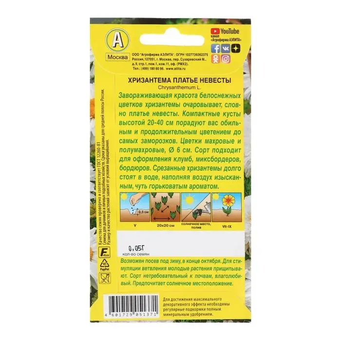 Семена цветов Хризантема махровая "Платье невесты", О, 0,05 г