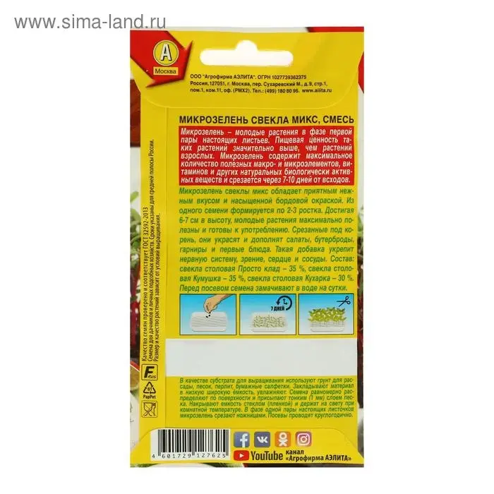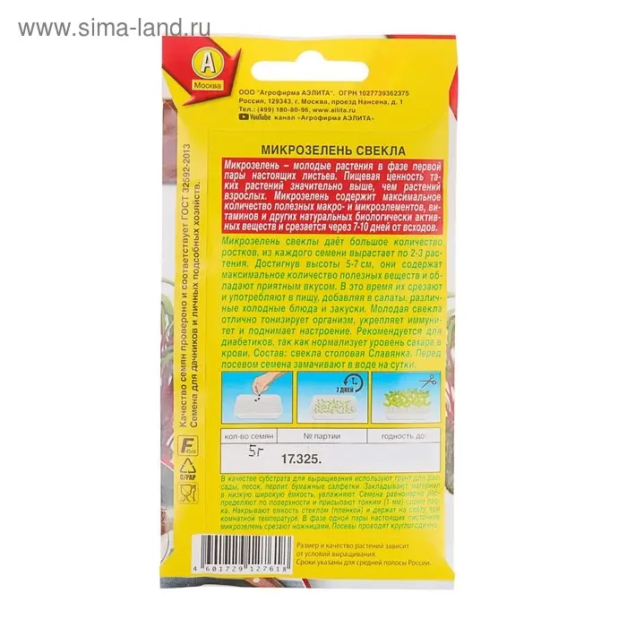 Спелая зелень содержит микроэлементы, полезные вещества, имеет приятный сладковатый привкус, который выгодно подчеркнёт кулинарные творения повара. Свёкла вырастает до 25 см. Посаженный в грунт или стерильный субстрат семян даёт всходы через 7 дней, достигает технической зрелости через 3 дня, при хорошем освещении и поливе вырастает крупным и сочным. Схема посадки — 0,5 × 0,5 см, глубина заделки — 1 см.