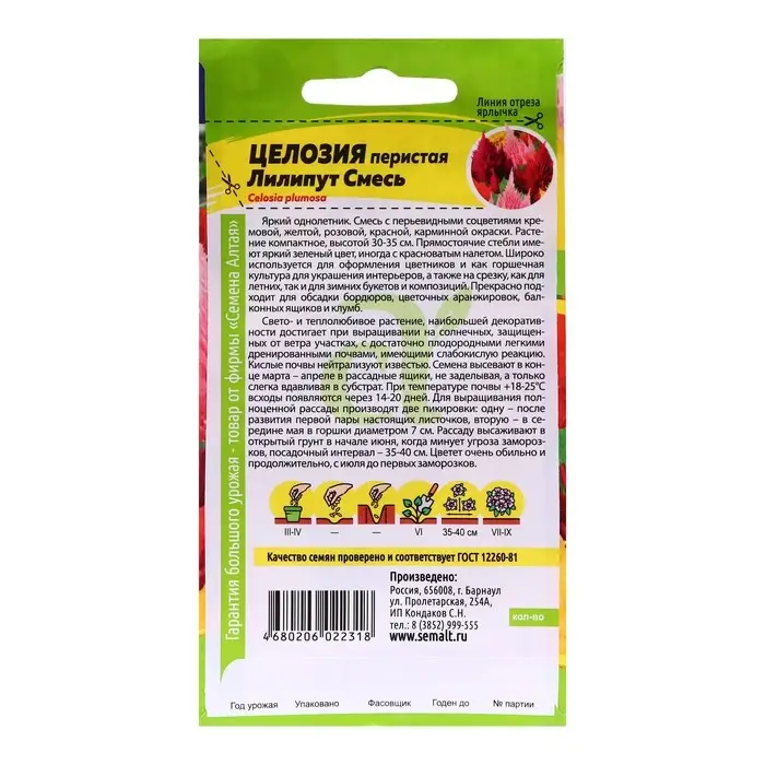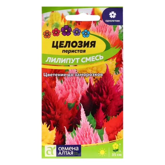Яркий однолетник. Смесь с перьевидными соцветиями кремовой, желтой, розовой, красной, карминной окраски. Растение компактное, высотой 30-35 см. Прямостоячие стебли имеют яркий зеленый цвет, иногда с красноватым налетом. Цветет очень обильно и продолжительно, с июля до первых заморозков. Широко используется для оформления цветников и как горшечная культура для украшения интерьеров, а также на срезку, как для летних, так и для зимних букетов и композиций. Прекрасно подходит для обсадки бордюров, цветочных аранжировок, балконных ящиков и клумб. Свето- и теплолюбивое растение, хорошо растет на рыхлой легкой питательной почве.