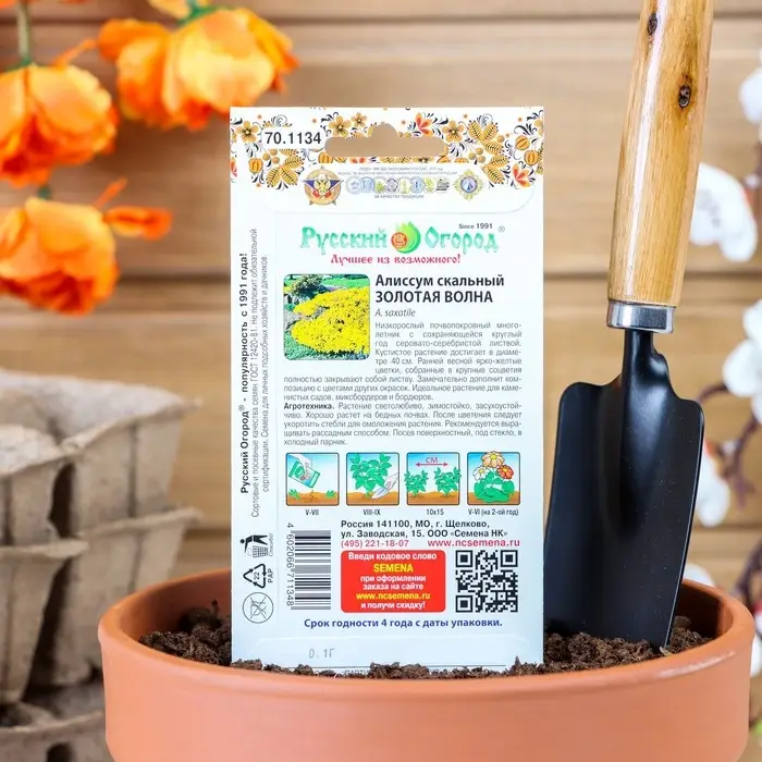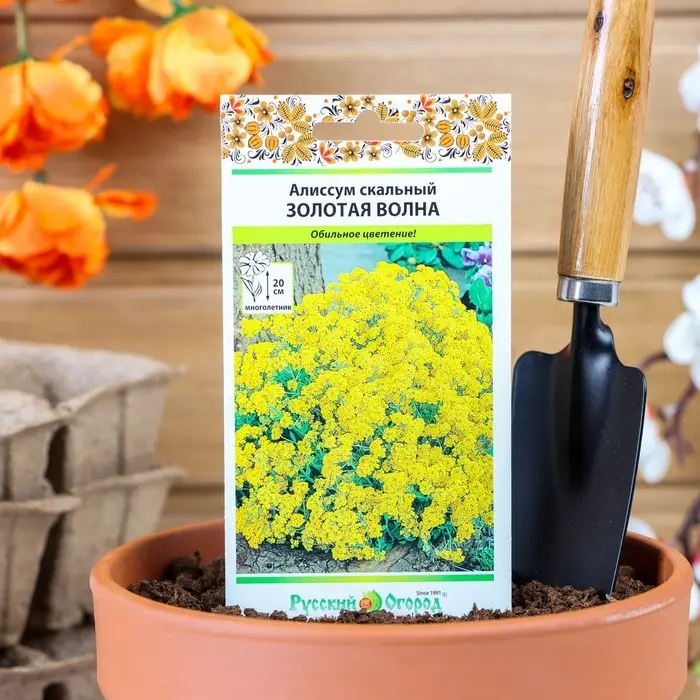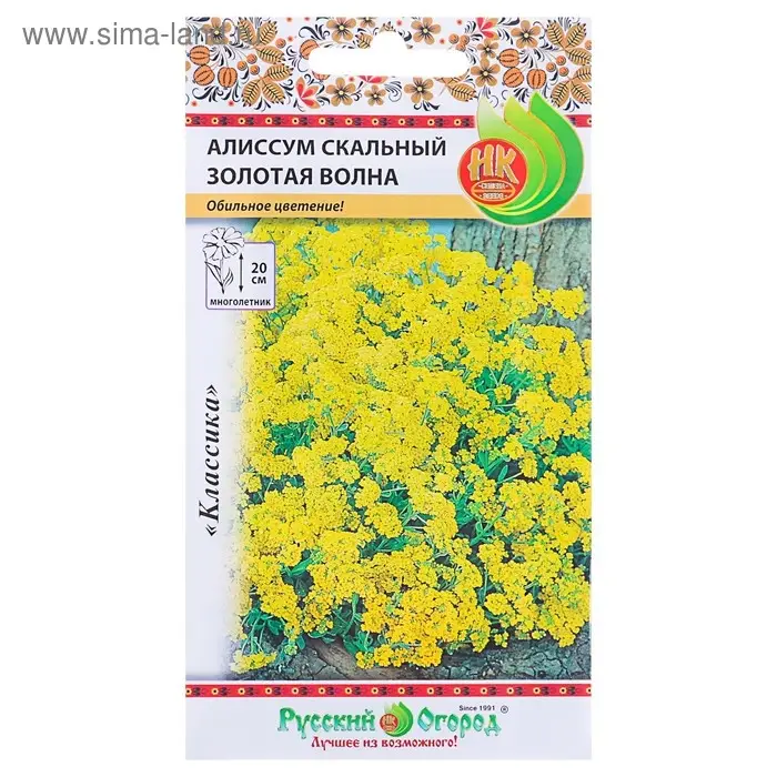 Алиссум Золотая Волна – роскошный сорт с яркими золотисто-желтыми соцветиями! Очень декоративен, легко вписывается даже уже в существующие композиции, чем помогает «освежить» их и придать изюминку. По сравнению с другими сортами алиссума, сорт Золотая Волна немного выше: 20 см – 25 см в длину. Каждый кустик разрастается до 40 см в диаметре, тем самым быстро привлекая к себе внимание. Цветение начинается уже спустя 1,5 месяца с начала посадки. Таким образом, при рассадном способе размножения цветение начнется уже в начале лета! Листва у сорта Золотая Волна серебристая, что также не характерно для данного вида растений. При обильном цветении, которое длится с начала лета до самых заморозков, листву практически не видно.