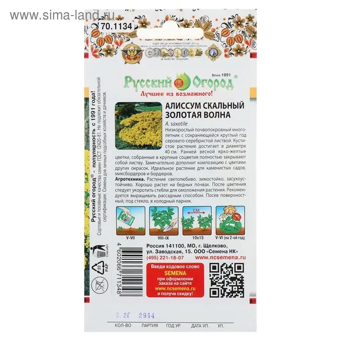 Семена цветов Алиссум "Золотая волна" скальный, серия Русский огород, Мн, 0,1 г
