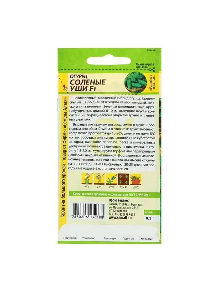 Семена Огурец "Соленые уши" F1, среднеспелый, партенокарпический, цп, 0,3 г