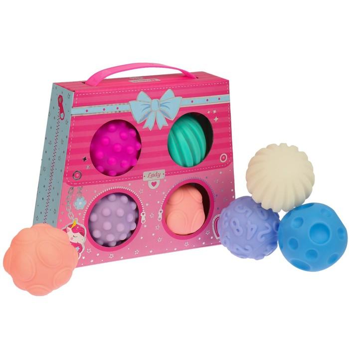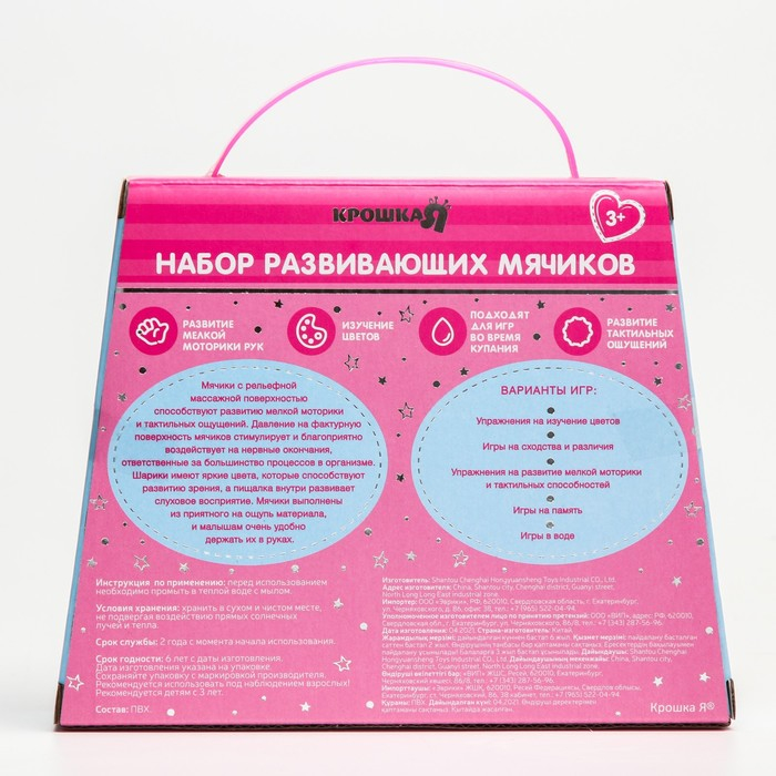 Мячики с рельефной массажной поверхностью способствуют развитию мелкой моторики и тактильных ощущений. Давление на фактурную поверхность мячиков стимулирует и благоприятно воздействует на нервные окончания, ответственные за большинство процессов в организме. Шарики имеют яркие цвета, которые способствуют развитию зрения, а пищалка внутри развивает слуховое восприятие.