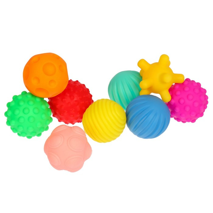 Мячики с рельефной массажной поверхностью способствуют развитию мелкой моторики и тактильных ощущений. Давление на фактурную поверхность мячиков стимулирует и благоприятно воздействует на нервные окончания, ответственные за большинство процессов в организме. Шарики имеют яркие цвета, которые способствуют развитию зрения, а пищалка внутри развивает слуховое восприятие.