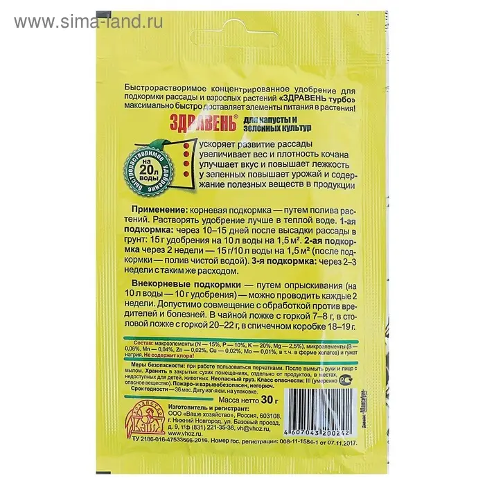 Удобрение Здравень турбо для капусты и зеленных культур, 30 г