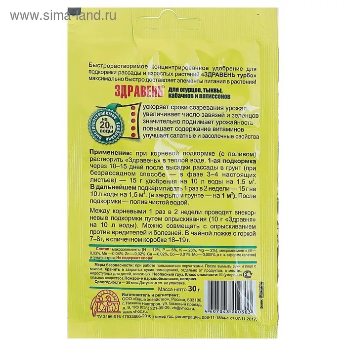 Удобрение Здравень турбо для огурцов, тыквы, кабачков и патиссонов, 30 г
