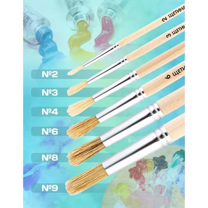 Набор кистей, щетина, плоские, 6 штук: № 1, 2, 3, 4, 5, 6, с деревянными ручками, на блистере