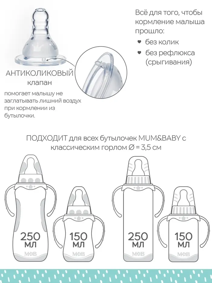 Соска для бутылочки силиконовой M&B, шир.горло, Ø70мм, от 3 мес, антиколиковая
