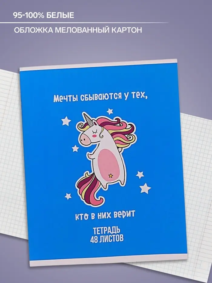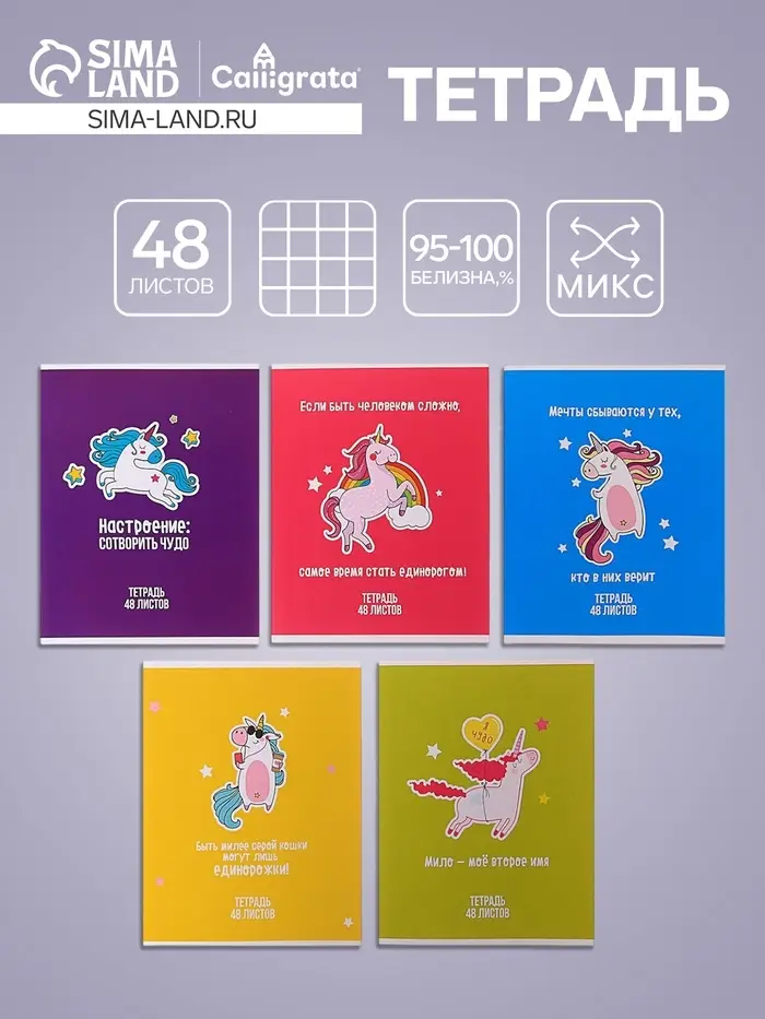 Тетрадь 48 листов в клетку Calligrata «Единорог», обложка мелованный картон, МИКС