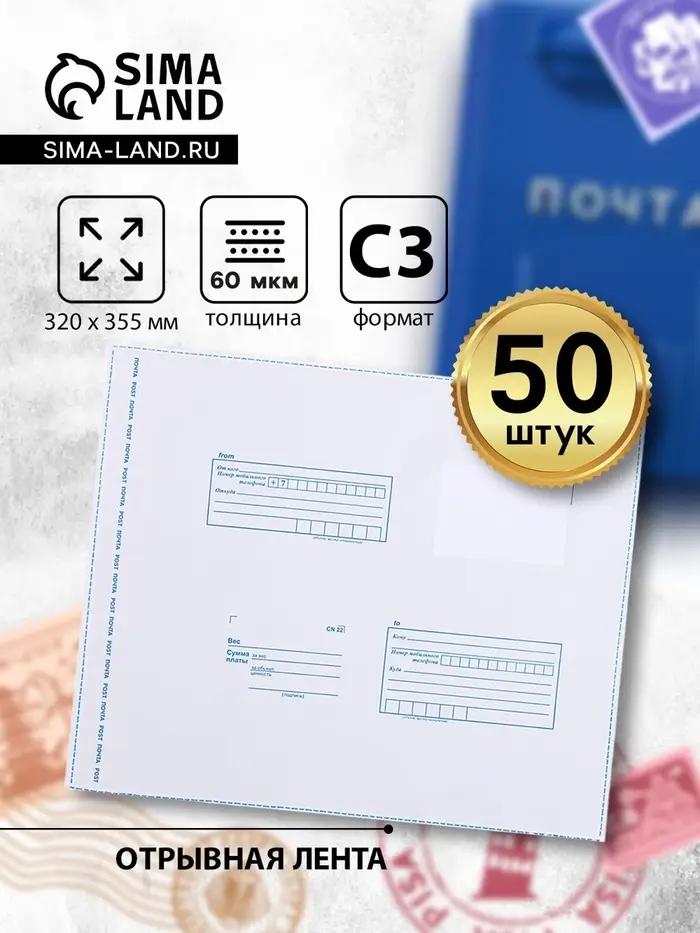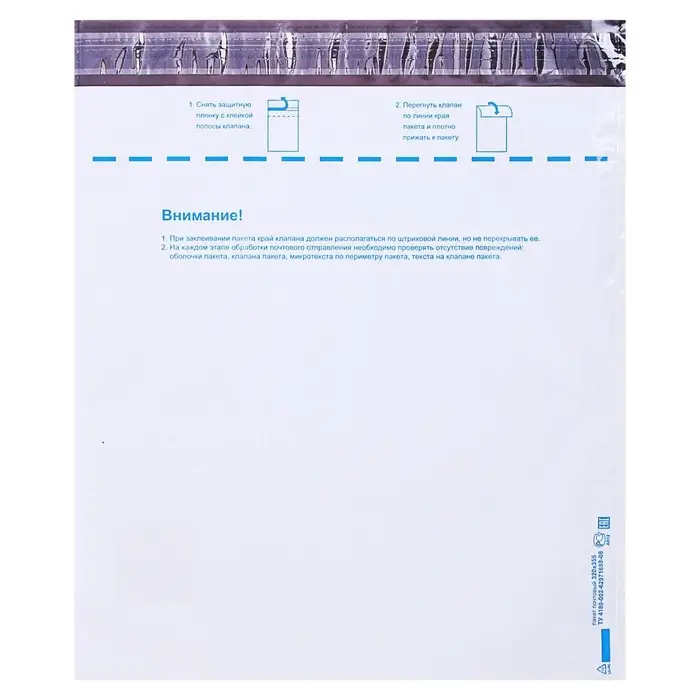 Пакет имеет размер 320х355 мм. Достаточно плотный и его содержимое не просматривается. Такой пакет особо прочен по сравнению с бумажными конвертами. Пластиковые пакеты соответствуют Техническим Условиям (ТУ) Почты России 2015 года и ПОУПС (Правилам оказания услуг Почтовой Связи) от 23 января 2015 год и принимаются во всех отделениях Почты России.