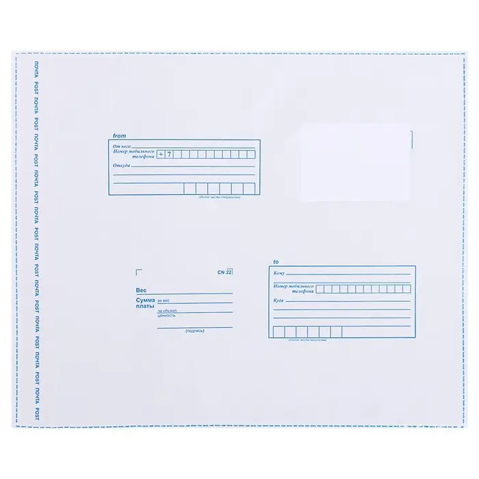 С почтовым пакетом Ваше почтовое отправление упакованное в пластиковый пакет никогда не промокнет и не испачкается. Это наиболее удобный способ аккуратно доставить Вашу посылку.