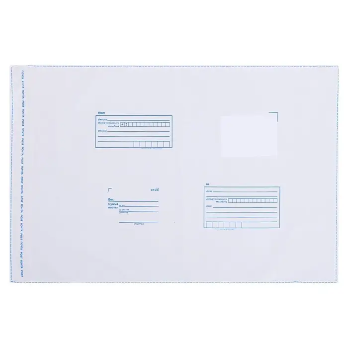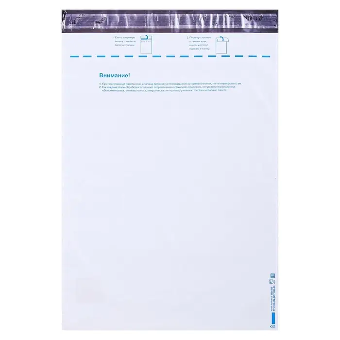 Пакет имеет размер 360х500 мм. Достаточно плотный и его содержимое не просматривается. Такой пакет особо прочен по сравнению с бумажными конвертами. Пластиковые пакеты соответствуют Техническим Условиям (ТУ) Почты России 2015 года и ПОУПС (Правилам оказания услуг Почтовой Связи) от 23 января 2015 год и принимаются во всех отделениях Почты России.