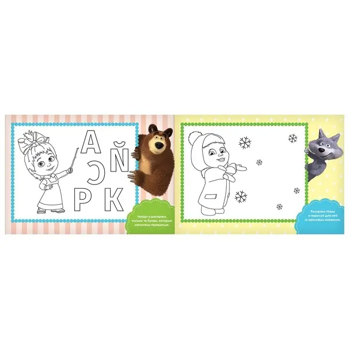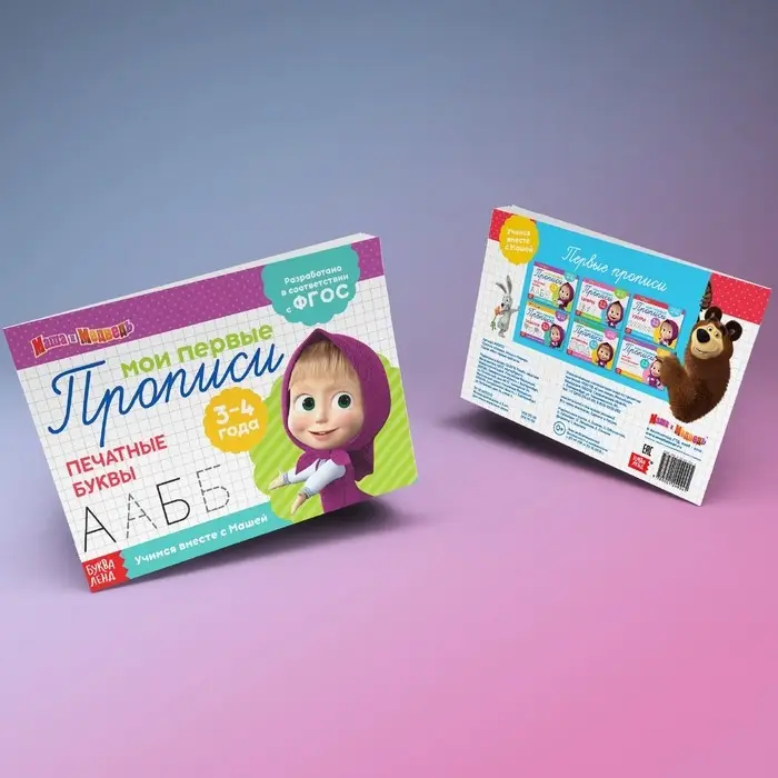 Внутри вы найдёте интересные задания. Выполняя их, малыш выучит буквы и подготовит руку к письму. Также в книге есть забавные иллюстрации с любимыми героями мультфильма «Маша и Медведь».