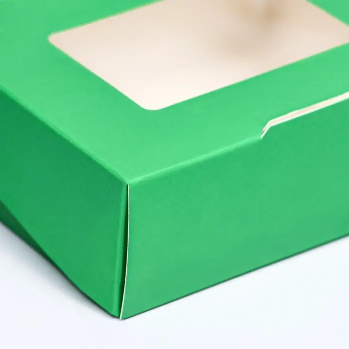 Коробка с откидывающейся крышкой для упаковки невысоких тортиков, пирожных и выпечки, а также сувениров и подарков полностью ламинирован изнутри.