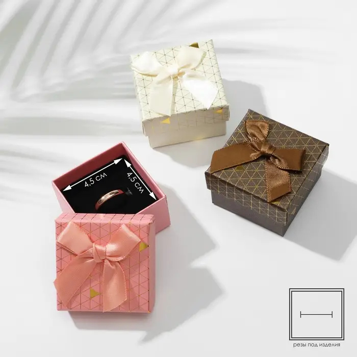 С нашими прекрасными коробочками любой подарок станет еще лучше и ярче. Футляр выполнен из прочного плотного картона. Оптимальный размер коробки 5*5см позволяет разместить кольцо. Внутри каждой коробочки с крышкой есть чёрная бархатная подложка. С помощью специальных прорезей на подушечке можно аккуратно разместить и зафиксировать украшение. А если убрать подложку, упаковка подойдет даже для часов с мягким плоским ремешком или на цепи.