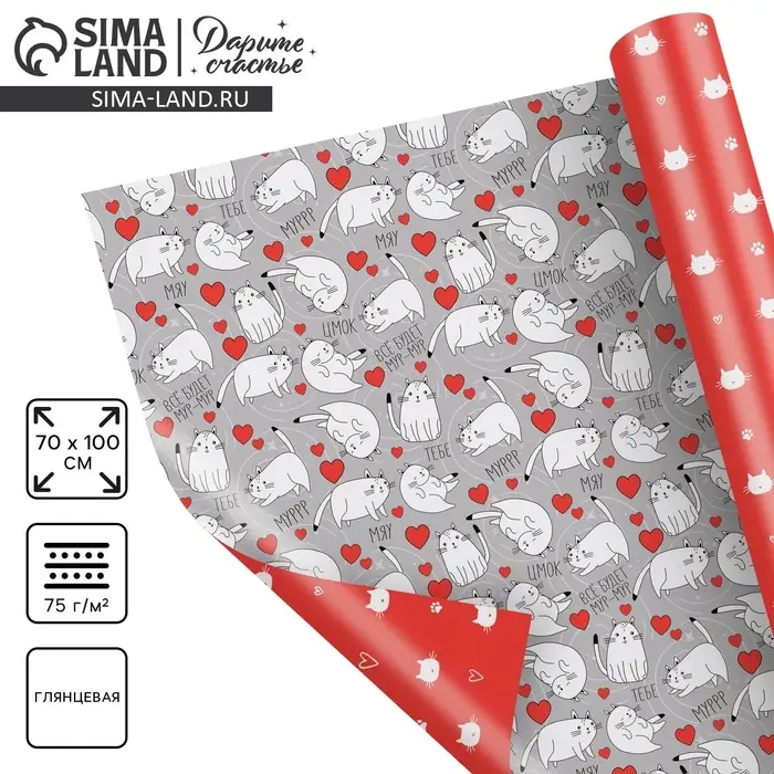Бумага упаковочная глянцевая двухсторонняя «Коты», 70 х 100 см