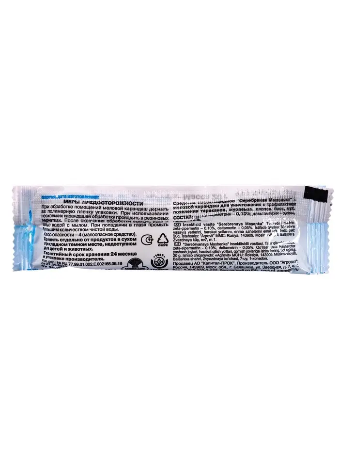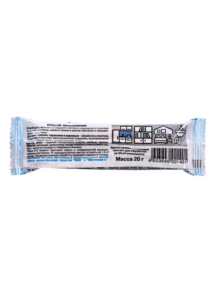 Средство предназначено для уничтожения тараканов, муравьев, клопов, блох и обработки мест посадки мух на объектах различных категорий как персоналом организаций, имеющих право заниматься дезинфекционной деятельностью, так и населению в быту.СОСТАВЗетациперметрин – 0,1%, дельтаметрин – 0,05%, гипс, мел.СПОСОБ ПРИМЕНЕНИЯОсвободите часть карандаша из упаковки и, держа за полиэтилен, нанесите несколько полос шириной 2-4см на поверхности, которые могут быть местами передвижения, скопления или обитания насекомых. Повторные обработки проводят по энтомологическим показаниям (при появлении насекомых). Норма расхода 1 карандаша (массой 20-30г) на 20-30м2 обрабатываемой поверхности.синатропные тараканы: мелком наносят полосы по поверхностям плинтусов, дверных коробок, вентиляционных решеток, по задним стенкам шкафов, столов, тумб, по трубам водопроводной и отопительной систем (особенно в местах их ввода и вывода). Обрабатывают поверхности в местах сбора мусора и нижнюю часть раковин. Обработку проводят одновременно во всех помещениях, где обнаружены тараканы а также смежных помещениях, чтобы предотвратить их заселение.рыжие домовые муравьи: мелком обрабатывают места их скопления и пути передвижения «дорожки».постельные клопы: средство наносят полосами на места обнаружения или возможного обитания насекомых таких, как картины, мебель и задняя поверхность ковров.блохи: мелком обрабатывают плинтусы и стены на высоту не более 1м, а также проводят полосы вдоль щелей в полу, между стенами и плинтусами.комнатные мухи: мелком проводят полосы по стыкам стекол и рам, по верхним частям дверей, шкафов, кухонной мебели и другим местам вероятной посадки.
