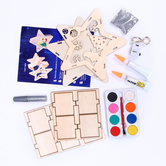 С набором для творчества «Новогодний ночник» у вас получится создать стильный светильник. Для этого в наборе вы найдёте всё необходимое.