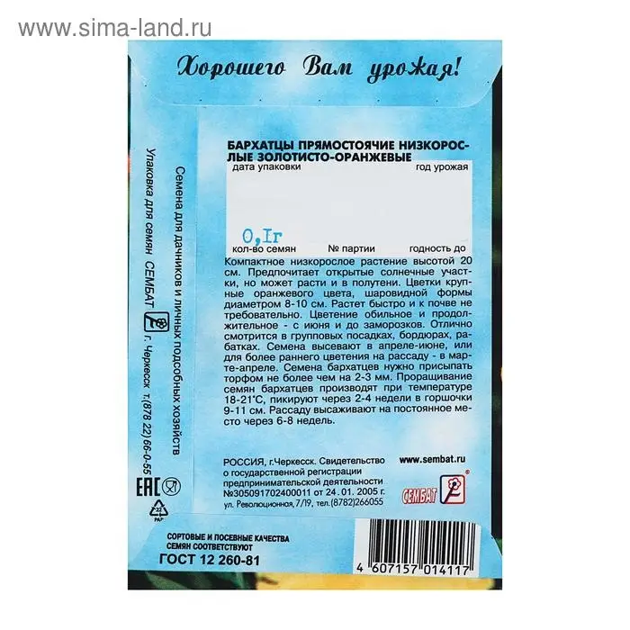 Семена цветов Бархатцы прямостоячий низкорослый золотисто-оранжевый, О, 0,1 г