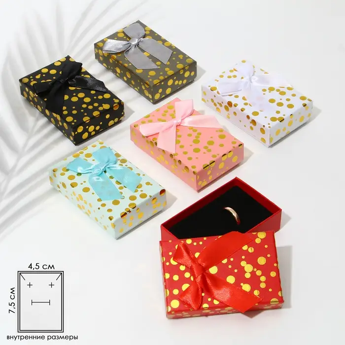 С нашими прекрасными коробочками любой подарок станет еще лучше и ярче. Футляр выполнен из прочного плотного картона. Оптимальный размер коробки 5*8см позволяет разместить разнообразные виды ювелирных изделий – от сережек до колье. Внутри каждой коробочки с крышкой есть чёрная бархатная подложка. С помощью специальных прорезей на подушечке можно аккуратно разместить и зафиксировать цепочки, гвоздики и перстни. А если убрать подложку, упаковка подойдет даже для часов с мягким плоским ремешком или на цепи.