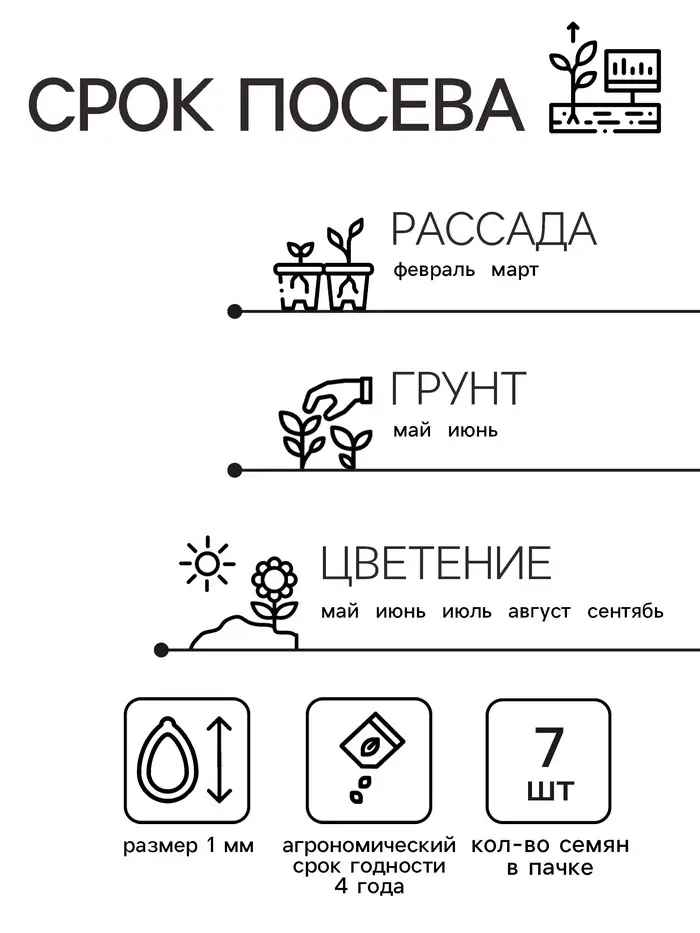 Посев на рассаду с февраля до апреля. Семена в гранулах! Посев поверхностный, без заделки (семена прорастают на свету!), под стекло или пленку для сохранения постоянной влажности до полных всходов. Гранулы при посеве должны раствориться! Февральским посевам требуется дополнительная подсветка. Всходы появляются на 5-6 день. Пикировка в фазе 1-2-х настоящих листьев. Высадка в грунт закаленной рассады в конце мая.