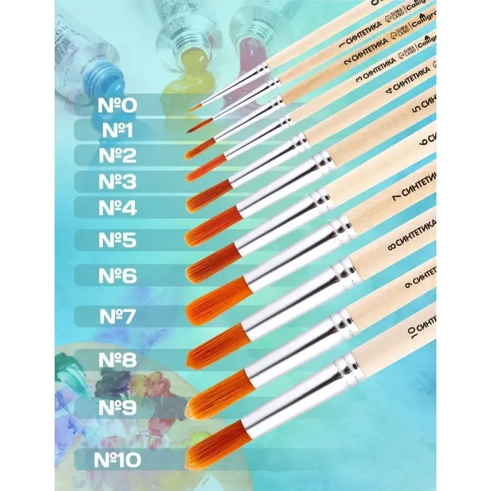 Синтетический волос имеет гладкую структуру и обладает капиллярным эффектом, что позволяет использовать такие кисти при работе с акварелью, гуашью, темперой, акрилом и маслом.