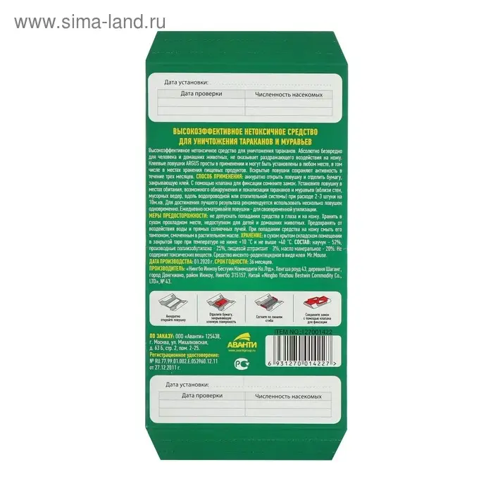 Аргус (Argus) PROF клеевая ловушка - это высокоэффективное, нетоксичное (нет яда) средство для уничтожения насекомых и грызунов. Абсолютно безвредно для человека и домашних животных, не оказывает раздражающего воздействия на кожу.Argus PROF клеевая ловушка от тараканов и муравьев (домик с приманкой аттракантом + делится на 2 домика + вертикальное размещение + календарь проверки численности насекомых).СОСТАВКаучук - 52%, производные полиизобутилена - 25%, пищевой аттрактант - 3%, масло минеральное - 20%.СПОСОБ ПРИМЕНЕНИЯКлеевые ловушки Аргус (Argus) PROF просты в применении и могут быть установлены в любом месте, в том числе в местах хранения пищевых продуктов. Вскрытые ловушки сохраняют активность в течении трех месяцев. Способ применения: Аккуратно открыть ловушку и отделить бумагу, закрывающую клей. С помощью клапана для фиксации сомкните замок. Установите ловушку вблизи стен, узких проемах. Для достижения лучшего результата рекомендуется использовать несколько ловушек одновременно. Ежедневно осматривайте ловушки - для своевременной утилизации.