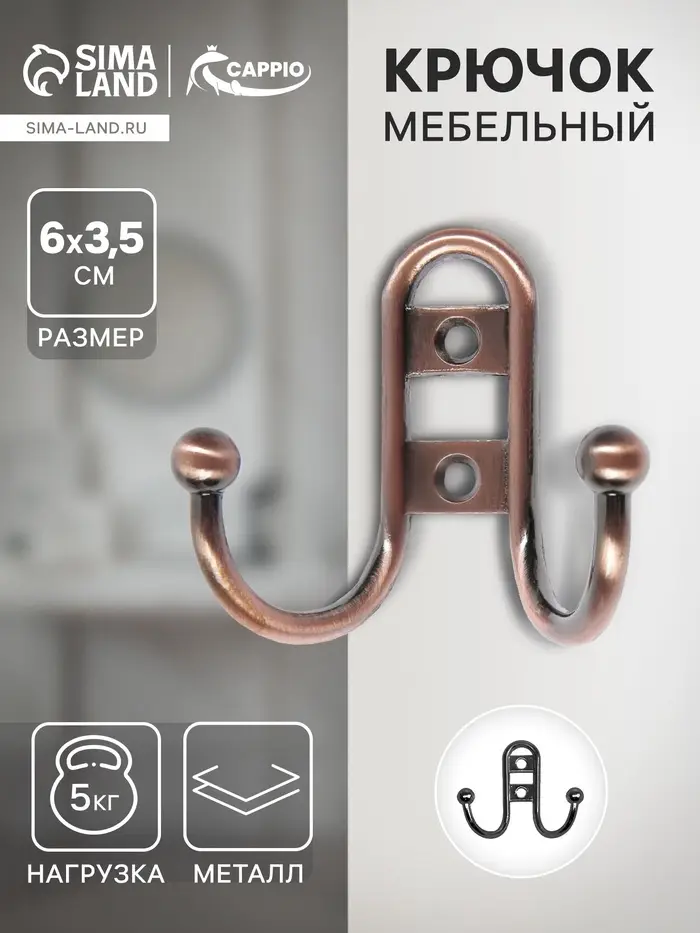 Крючок мебельный ТУНДРА TKd=016, двухрожковый, медь