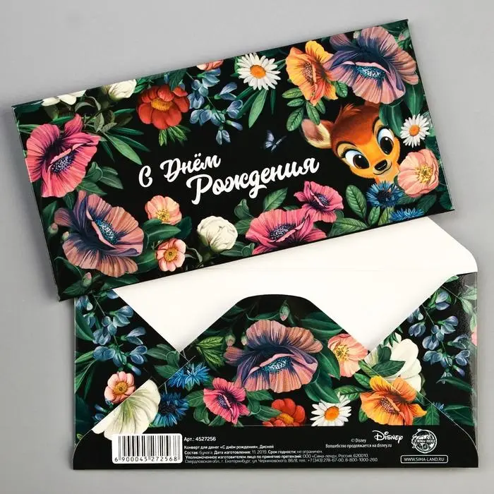 Конверт для денег, 16.5 х 8 см «С днём Рождения», Бэмби