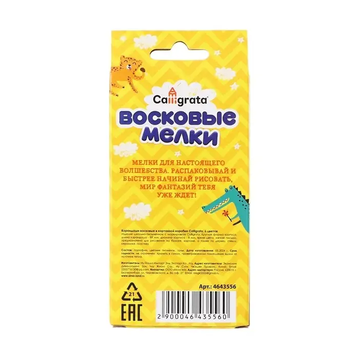 Мелки восковые 6 цветов, 93×8 мм, Calligrata, в картонной коробке