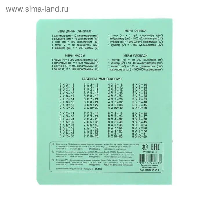 Тетрадь 18 листов, клетка, «Зелёная обложка», с таблицей умножения, термоупаковка, 25 шт.