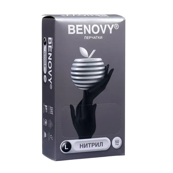 Перчатки Benovy, нитриловые, чёрные, 3 г, L, 50 пар/уп