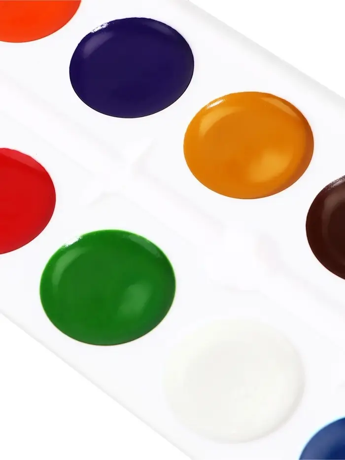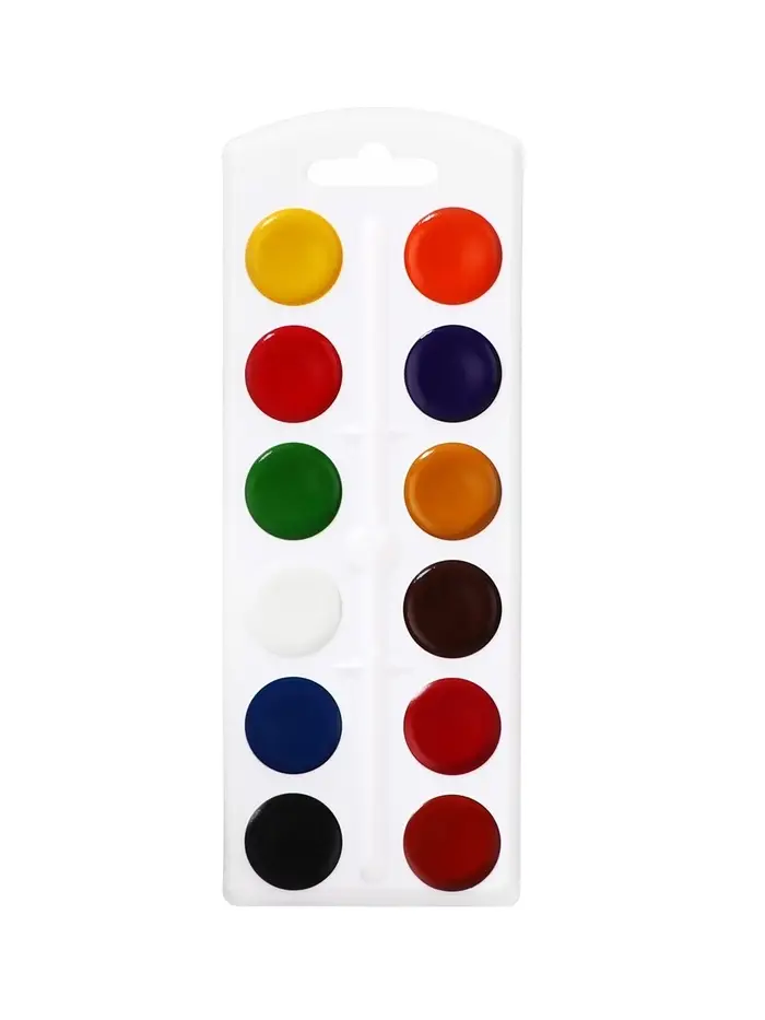 Набор акварельных красок в картонной упаковке. Включает 12 насыщенных цветов, подходит для творчества, обучения и художественных экспериментов. Удобный формат и качественная пигментация делают набор универсальным выбором для детей и взрослых.