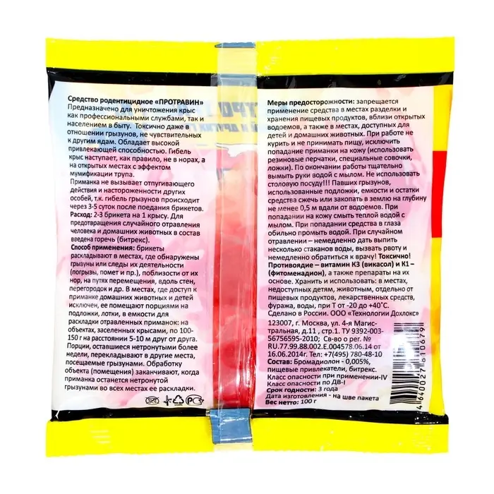 Предназначено для уничтожения крыс как профессиональными службами, так и в быту. Токсично даже в отношении грызунов, не чувствительных к другим ядам. Обладает высокой привлекающей способностью. Гибель грызунов наступает, как правило, не в норах, а на открытых местах с эффектом мумификации трупа. Приманка не вызывает отпугивающего действия и настороженности других особей, т.к. гибель грызунов происходит через 3-5 суток после ее поедания.