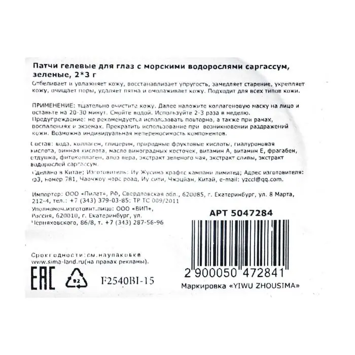 Гидрогелевые патчи для кожи вокруг глаз со спирулиной