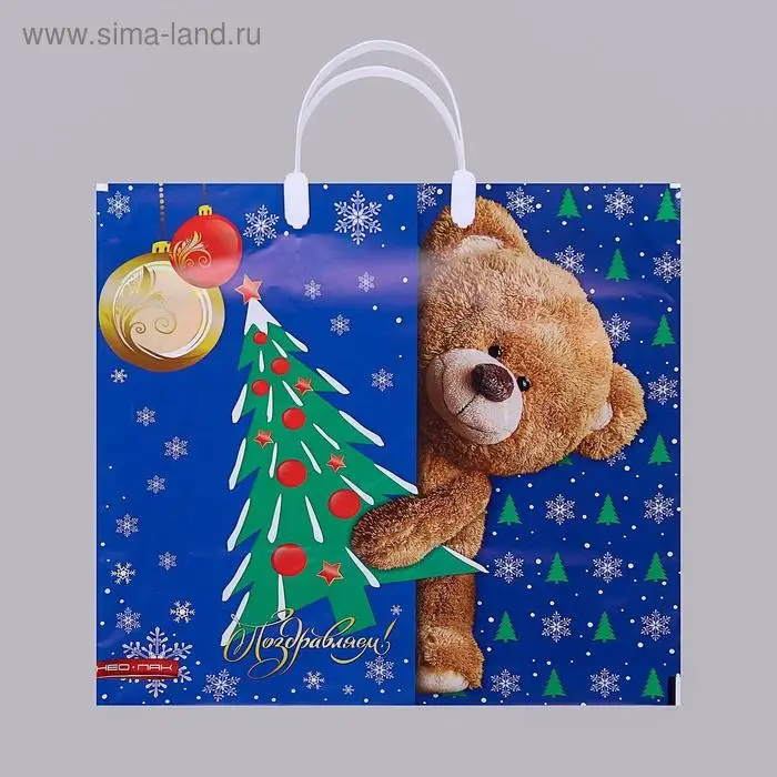Пакет «Мишка с елкой», полиэтиленовый с пластиковой ручкой, 37×35 см
