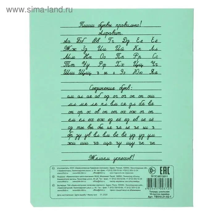 Тетрадь 18 листов в линейку «Зелёная обложка», с алфавитом, плотность 60 г/м², белые листы, термоупаковка 25 шт.