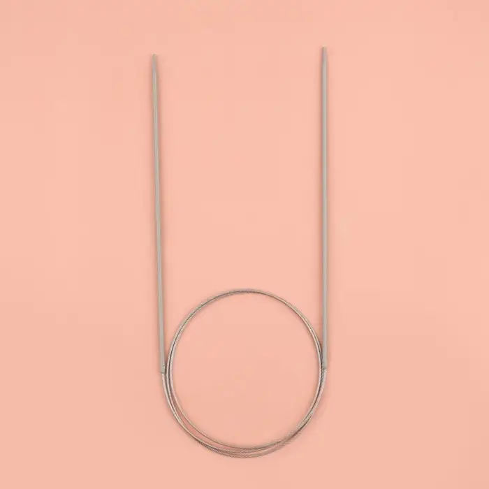 Круговые спицы представляют собой две металлические части, соединённые друг с другом тросиком. Инструмент незаменим при вязании полотна по кругу. С его помощью получаются изделия без дополнительных швов: шапки, рукава и горловины.
