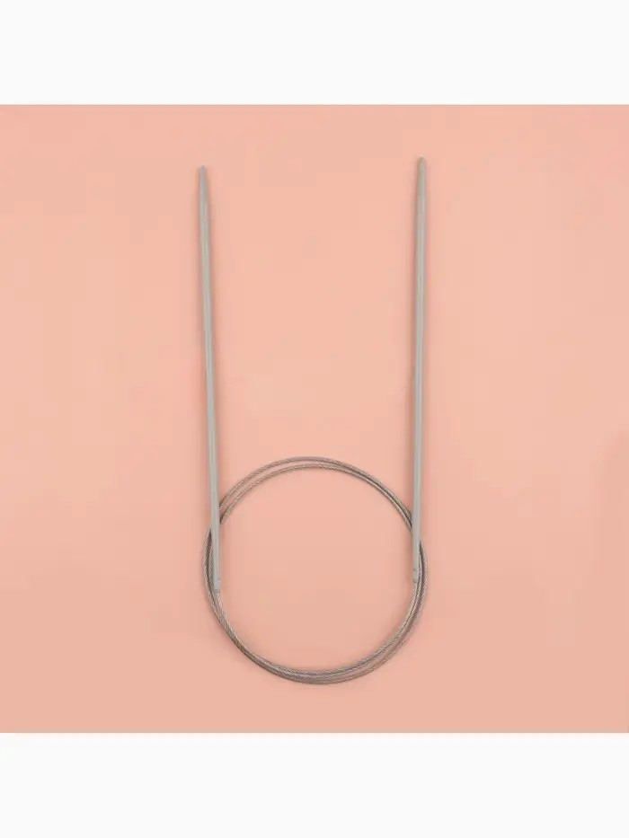 Круговые спицы представляют собой две металлические части, соединённые друг с другом тросиком. Инструмент незаменим при вязании полотна по кругу. С его помощью получаются изделия без дополнительных швов: шапки, рукава и горловины.